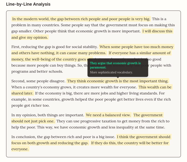 Each evaluation triggers two separate calls to Gemini 2.0 Flash via Vertex AI, running in parallel two tasks: (1) it produces the overall band score and criterion-level feedback; (2) and walks through the essay sentence by sentence, offering improvements with explanations.