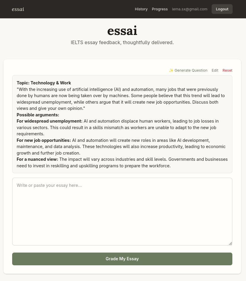 That's how this thing ("Essai") started. The idea is straightforward: you write/paste your essay, hit "Grade," and get back an overall score, per-criterion feedback, and (more interesting) sentence-level suggestions. I started with TOEFL since the English rubrics are the most widely available and easiest to validate, but the plan is to expand to other exams and languages, including the TestDaF that got me into this rabbit hole.